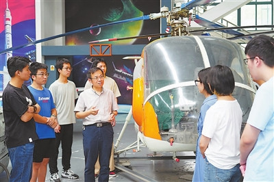 课程组教师在航空航天馆内的直升机(由南航师生研制的我国第一架自主设计制造的直升机“延安二号”)旁授课。资料图片