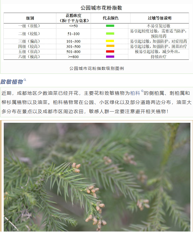 “成都气象”官方公众号提醒近期成都地区少数油菜已经开花,主要花粉致敏植物为柏科的侧柏属、刺柏属和柳杉属植物以及油菜,提醒敏感人群注意避开。