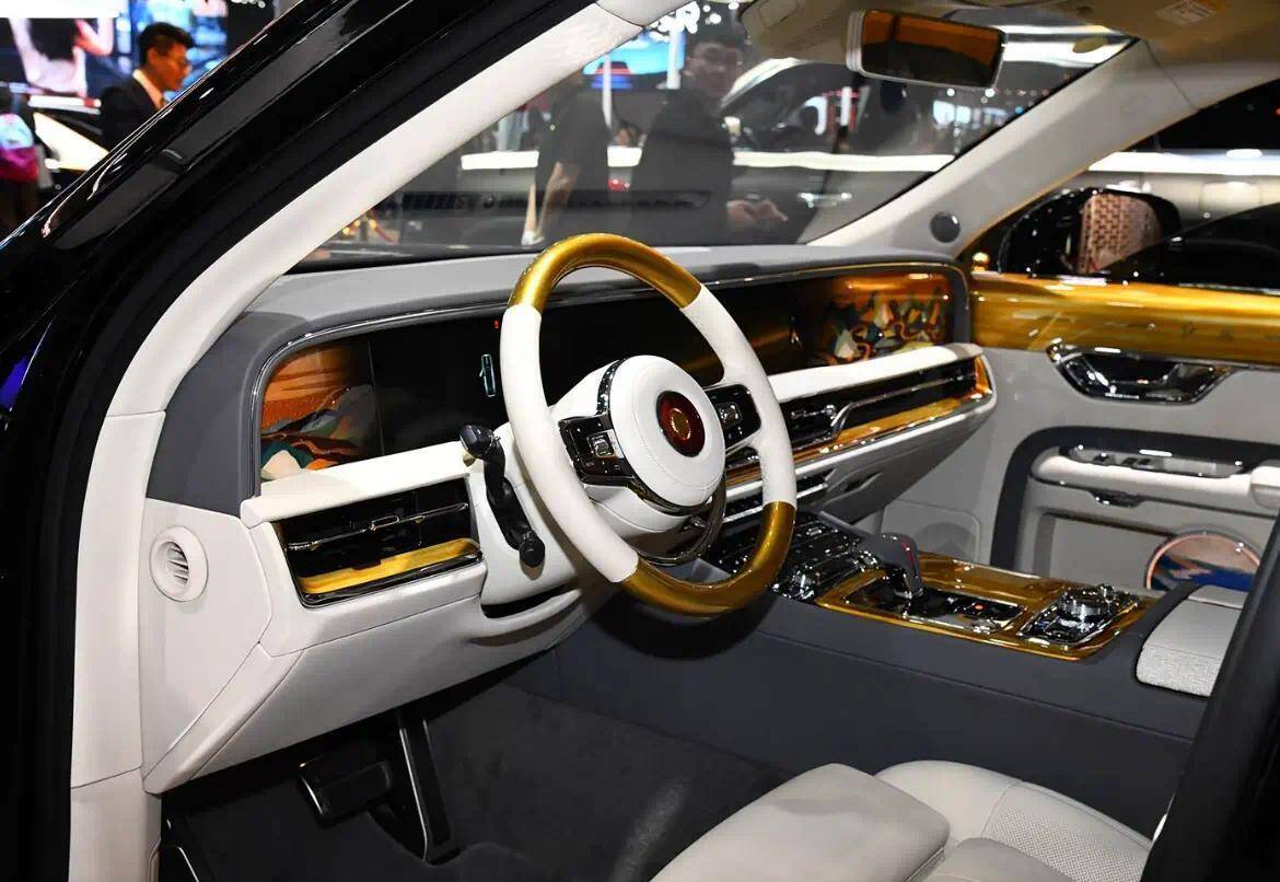 红旗金葵花国礼定制版内饰同样属于复古奢华的风格,提供大量金色装饰件,一些细节还增加了实木装饰件,全液晶仪表的尺寸为12.3英寸,中控屏幕的尺寸为16.2英寸,方向盘和座椅采用真皮材质,第二排还提供隐私玻璃,后风挡遮阳帘,后窗侧遮阳帘,部分配置将以选装的方式提供。